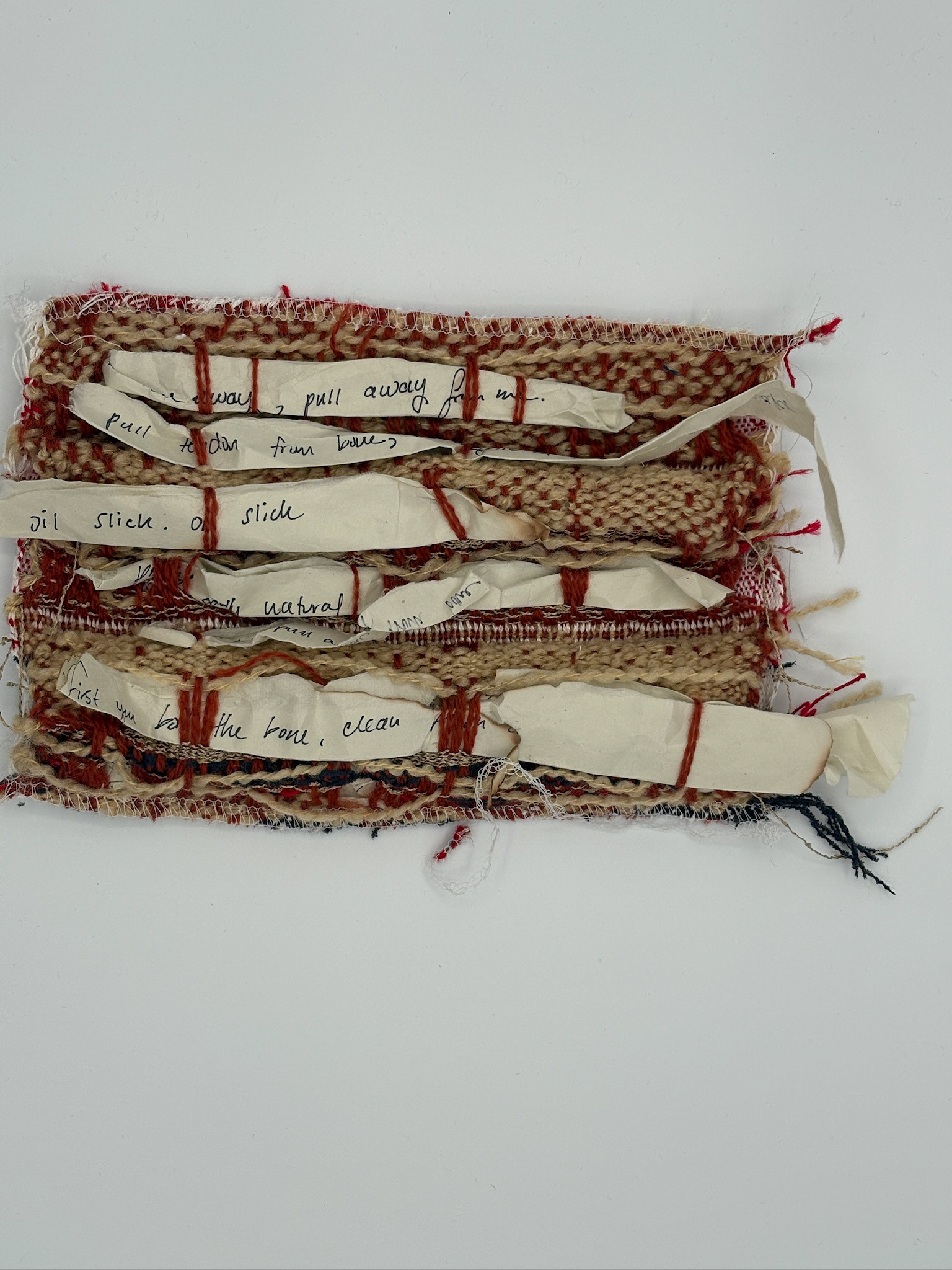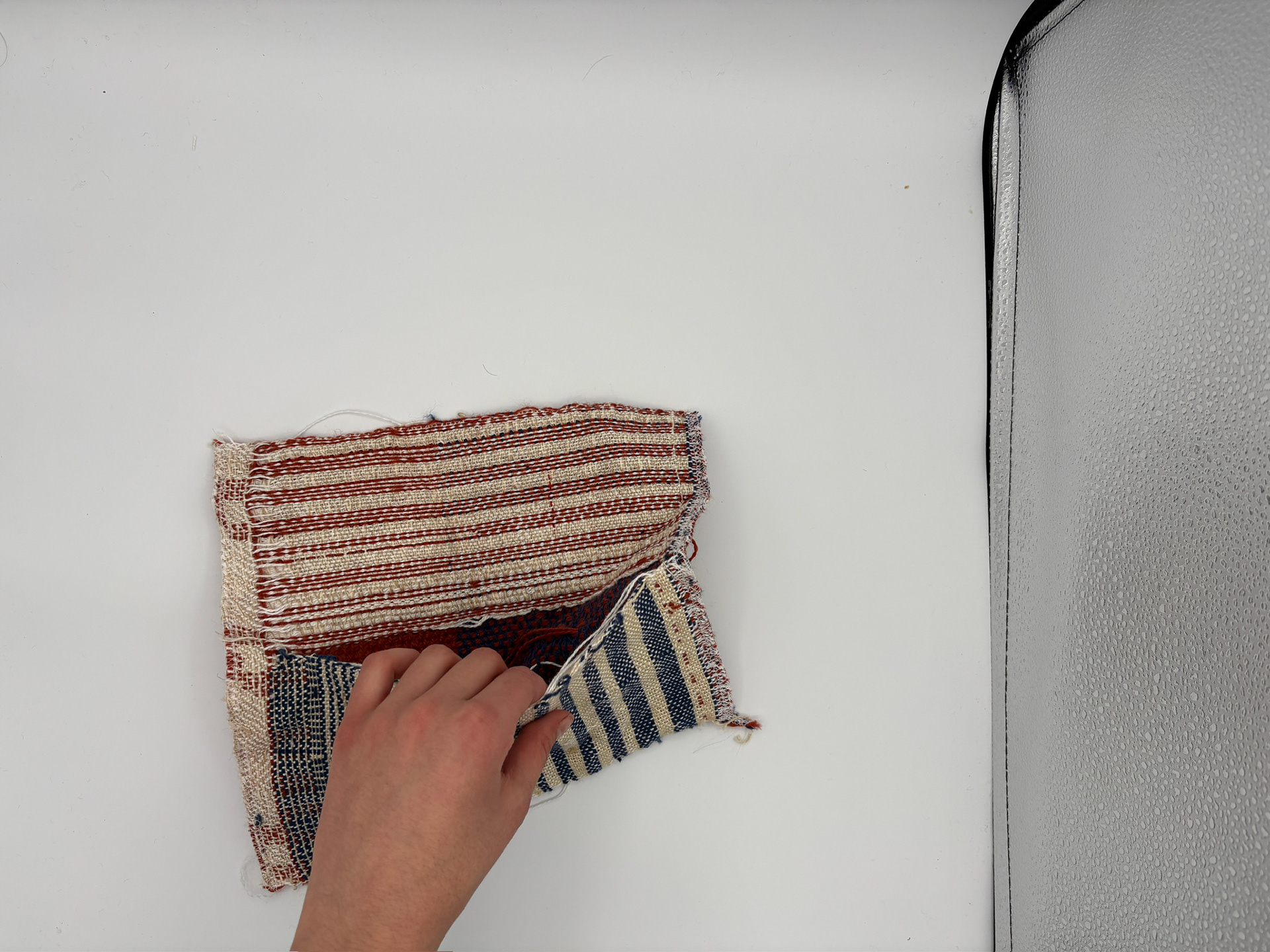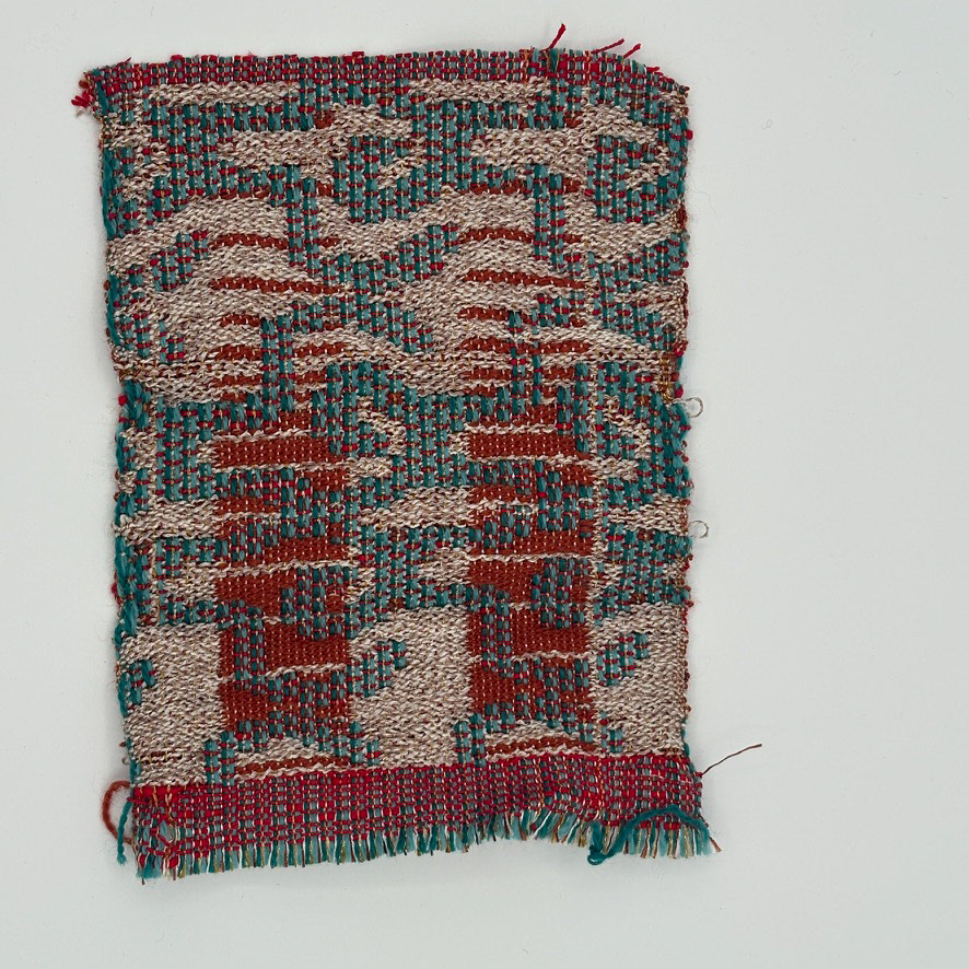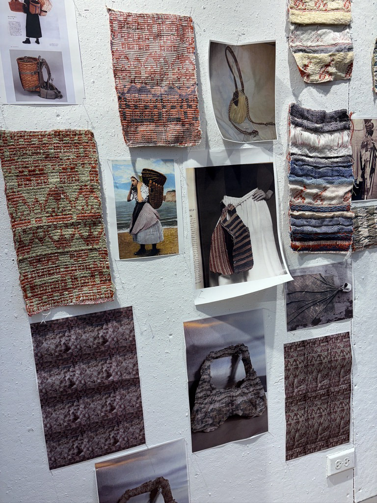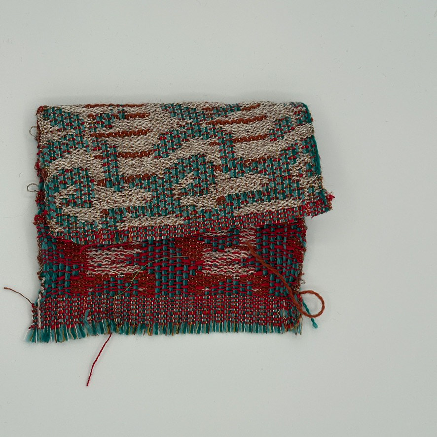 Programmed and woven by the artist on Compu-Dobby loom. Collection of samples inspired by fishwives of Brittany and Scotland, and women's workwear. Proposal for a bag. Emphasis on wovens with pleats.