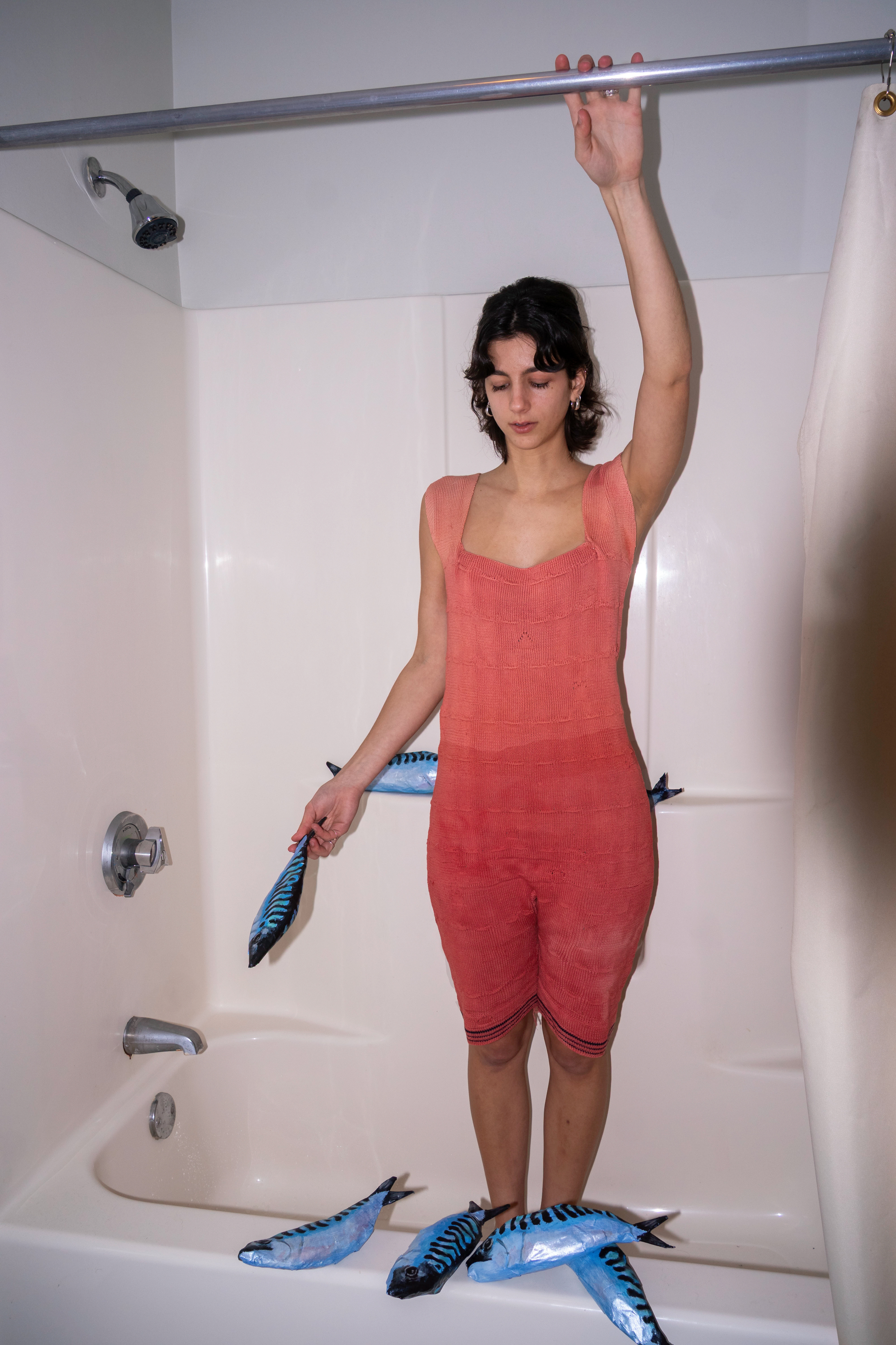 Julia wears The Dimpled Wading Suit. Inspired by silhouettes of 1920s bathing suits and fishwives of Scotland and Brittany and intersections of women's workwear and leisure-wear. Natural dye madder "wet look", as if the wearer has just gone for a dip.